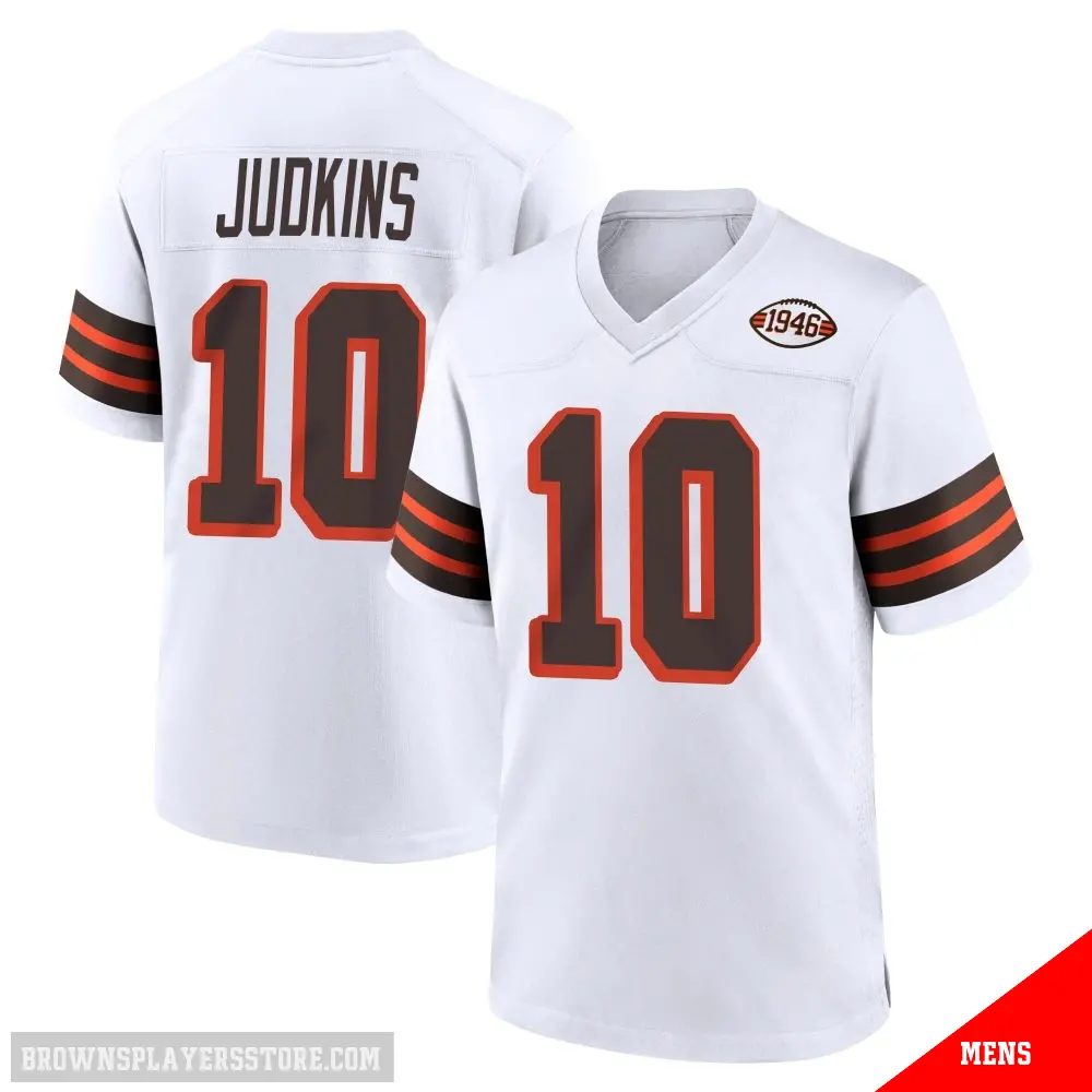 Display your Browns spirit year-round with this #10 Men's Quinshon Judkins White Game Cleveland Browns 1946 Collection Alternate Jersey. Whether you're in the crowd or lounging at home, it's the ideal way to showcase your love for Browns.