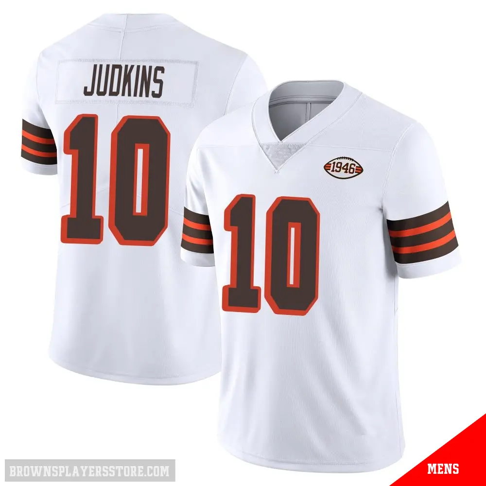 Display your Browns spirit year-round with this #10 Men's Quinshon Judkins White Limited Cleveland Browns Vapor 1946 Collection Alternate Jersey. Whether you're in the crowd or lounging at home, it's the ideal way to showcase your love for Browns.