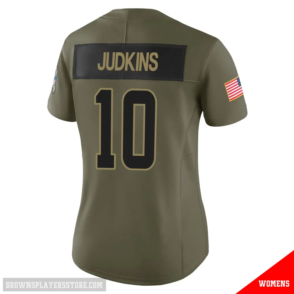 Display your Browns spirit year-round with this #10 Women's Quinshon Judkins Olive Limited Cleveland Browns 2025 Salute to Service Jersey. Whether you're in the crowd or lounging at home, it's the ideal way to showcase your love for Browns.
