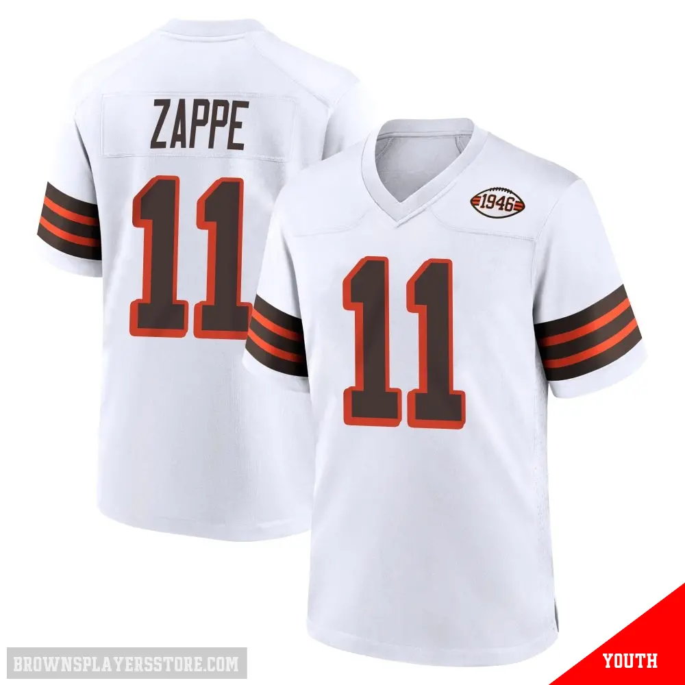 >Bailey Zappe Jersey>#11 Youth Bailey Zappe White Game Cleveland Browns 1946 Collection Alternate Jersey