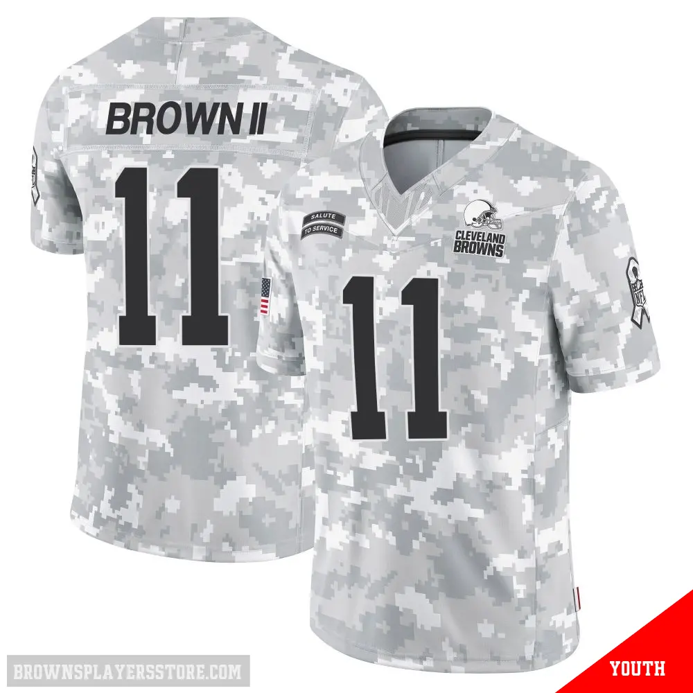 Display your Browns spirit year-round with this #11 Youth Tony Brown II Arctic Camo Limited Cleveland Browns 2024 Salute to Service Jersey. Whether you're in the crowd or lounging at home, it's the ideal way to showcase your love for Browns.