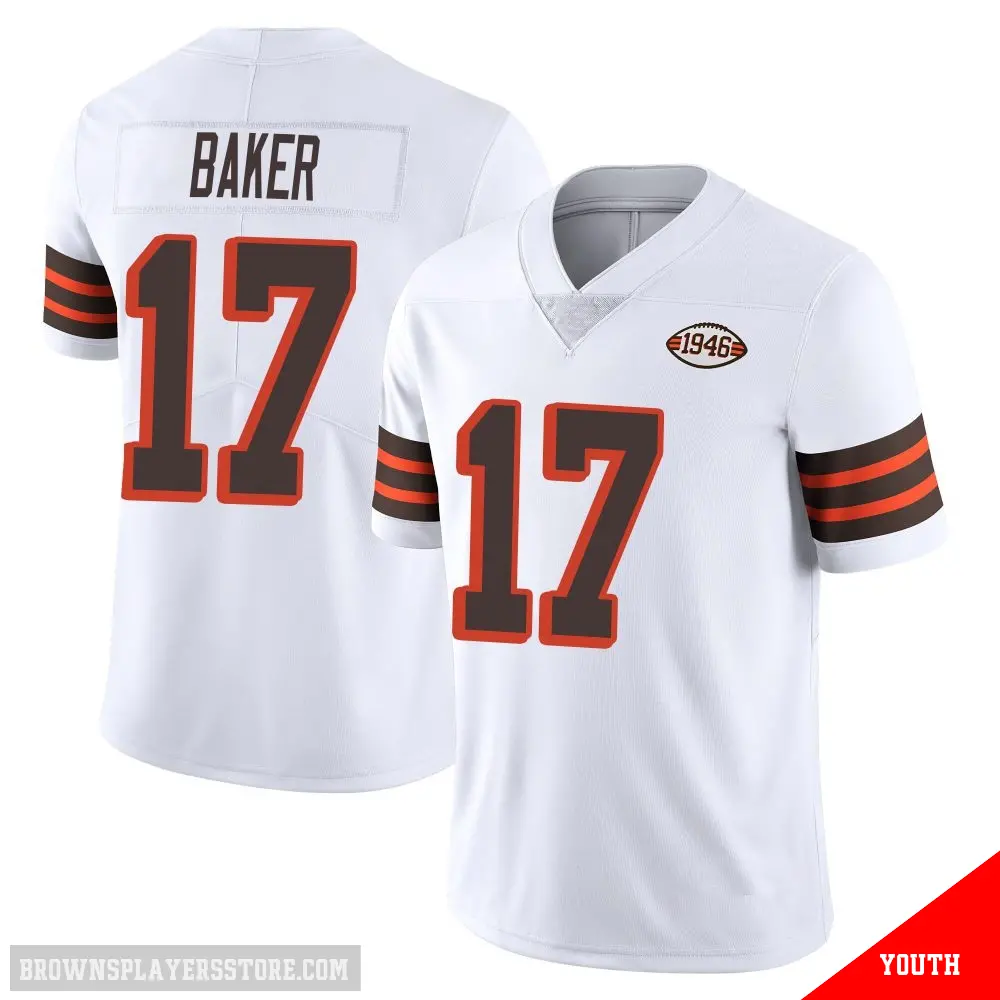 Display your Browns spirit year-round with this #17 Youth Jerome Baker White Limited Cleveland Browns Vapor 1946 Collection Alternate Jersey. Whether you're in the crowd or lounging at home, it's the ideal way to showcase your love for Browns.