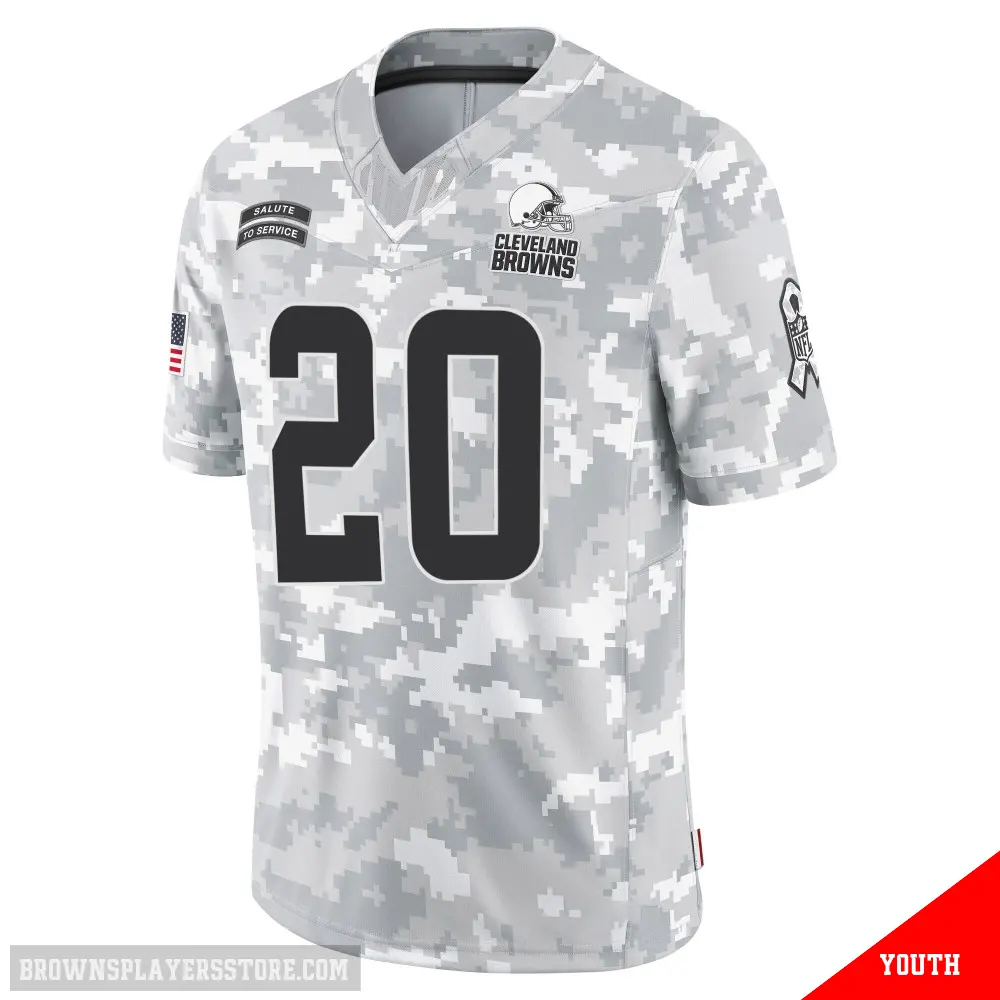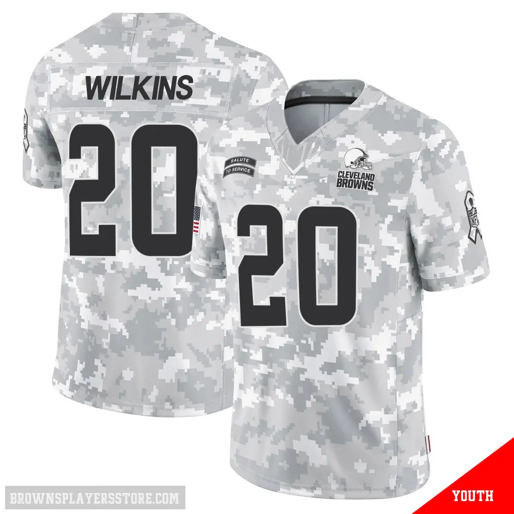 Display your Browns spirit year-round with this #20 Youth Jordan Wilkins Arctic Camo Limited Cleveland Browns 2024 Salute to Service Jersey. Whether you're in the crowd or lounging at home, it's the ideal way to showcase your love for Browns.