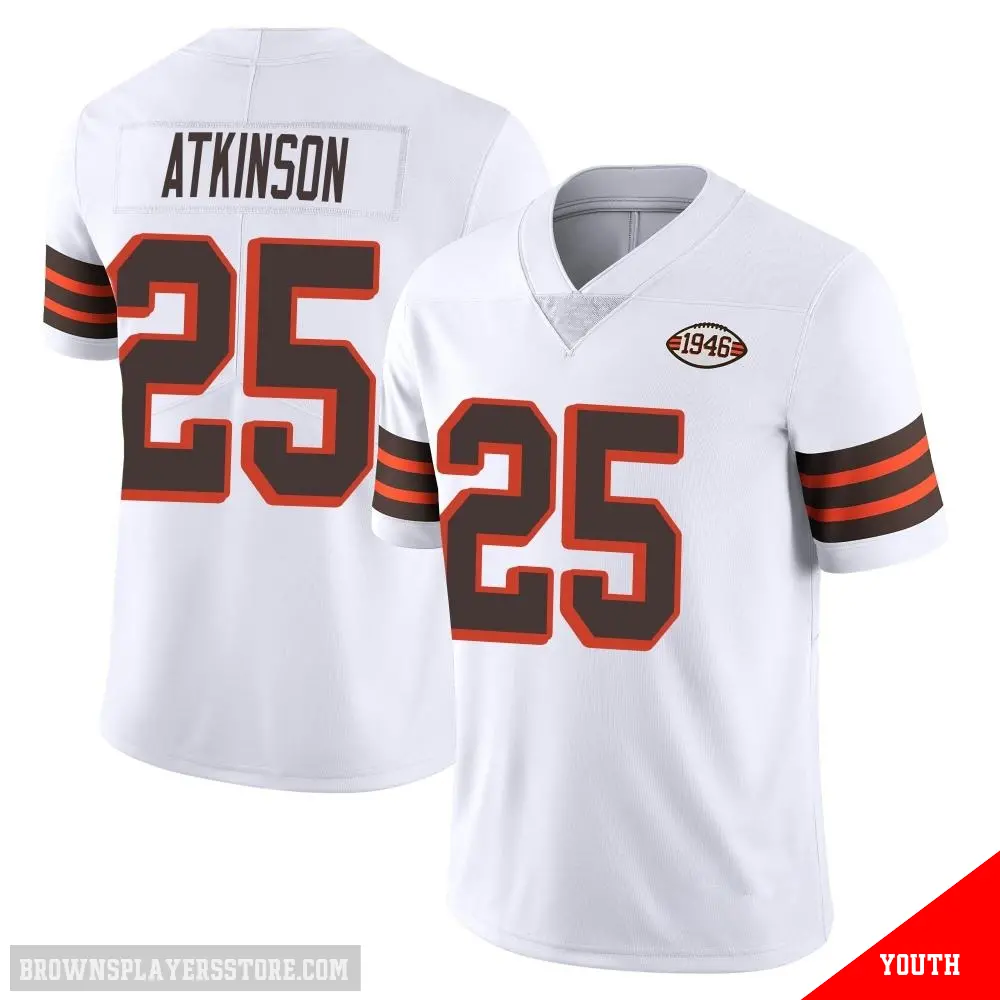 Display your Browns spirit year-round with this #25 Youth George Atkinson White Limited Cleveland Browns Vapor 1946 Collection Alternate Jersey. Whether you're in the crowd or lounging at home, it's the ideal way to showcase your love for Browns.
