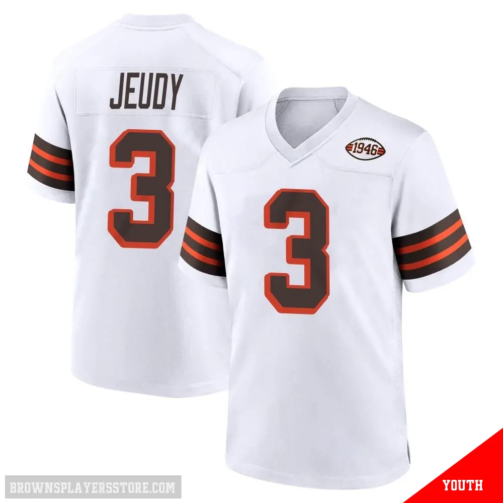 Display your Browns spirit year-round with this #3 Youth Jerry Jeudy White Game Cleveland Browns 1946 Collection Alternate Jersey. Whether you're in the crowd or lounging at home, it's the ideal way to showcase your love for Browns.