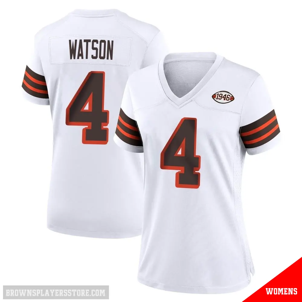 Display your Browns spirit year-round with this #4 Women's Deshaun Watson White Game Cleveland Browns 1946 Collection Alternate Jersey. Whether you're in the crowd or lounging at home, it's the ideal way to showcase your love for Browns.