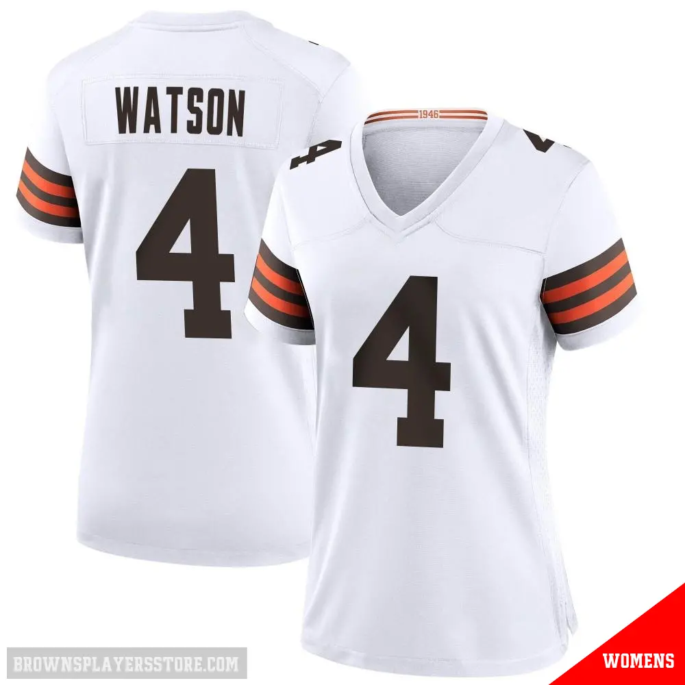 Display your Browns spirit year-round with this #4 Women's Deshaun Watson White Game Cleveland Browns Jersey. Whether you're in the crowd or lounging at home, it's the ideal way to showcase your love for Browns.