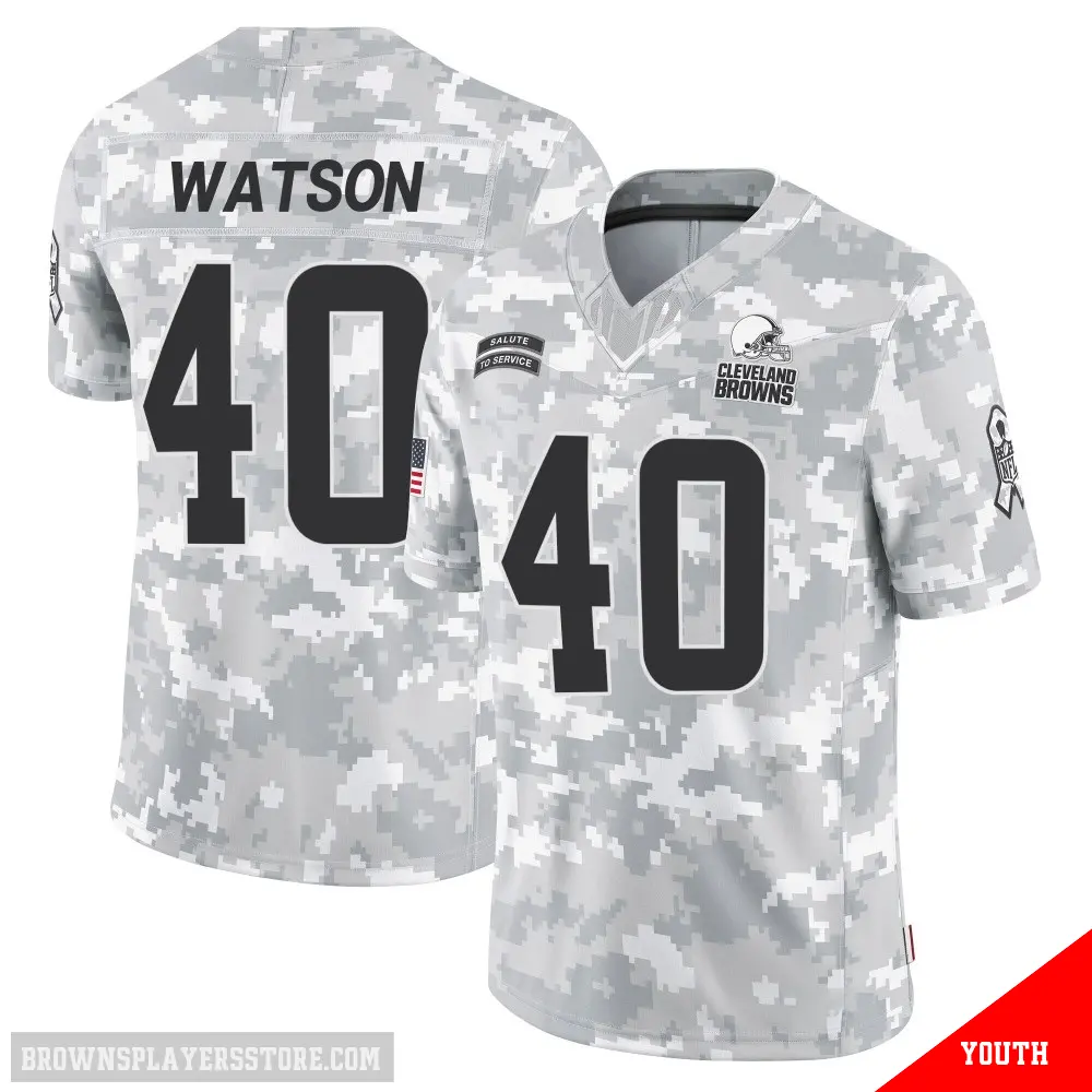 Display your Browns spirit year-round with this #40 Youth Nathaniel Watson Arctic Camo Limited Cleveland Browns 2024 Salute to Service Jersey. Whether you're in the crowd or lounging at home, it's the ideal way to showcase your love for Browns.