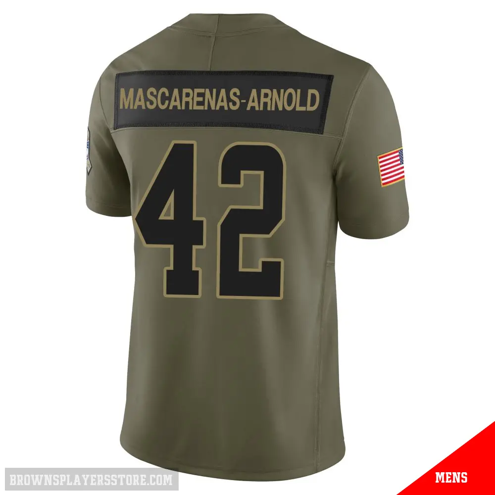 Display your Browns spirit year-round with this #42 Men's Easton Mascarenas-Arnold Olive Limited Cleveland Browns 2025 Salute to Service Jersey. Whether you're in the crowd or lounging at home, it's the ideal way to showcase your love for Browns.
