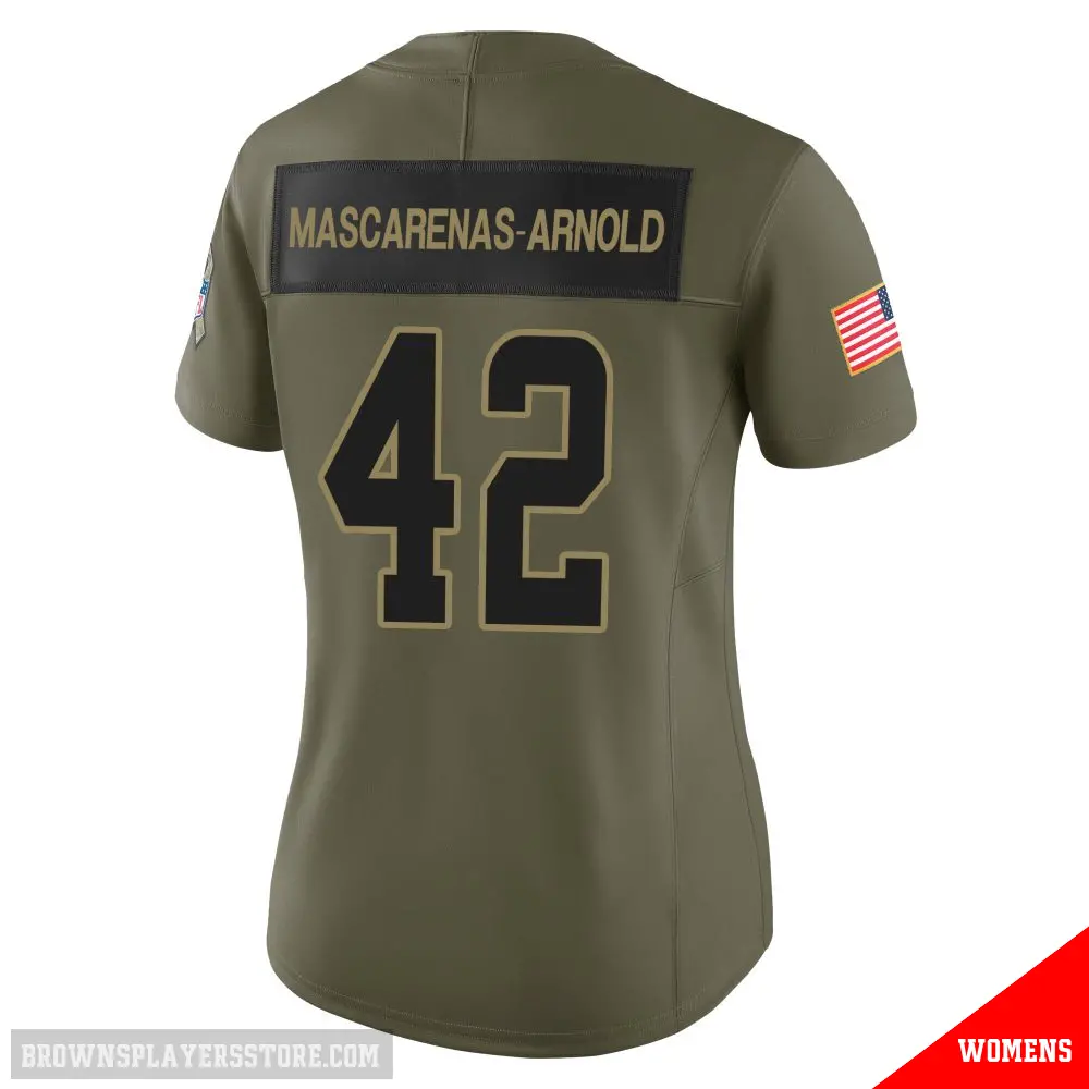 Display your Browns spirit year-round with this #42 Women's Easton Mascarenas-Arnold Olive Limited Cleveland Browns 2025 Salute to Service Jersey. Whether you're in the crowd or lounging at home, it's the ideal way to showcase your love for Browns.