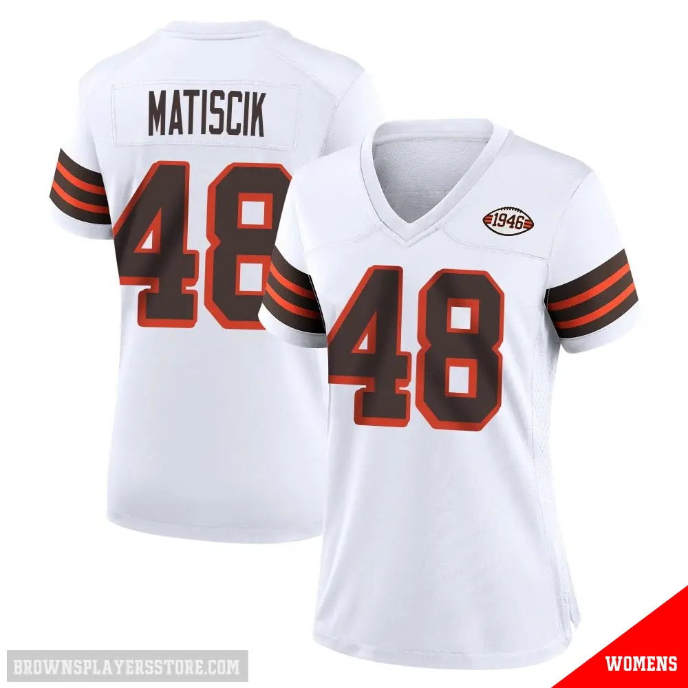 Display your Browns spirit year-round with this #48 Women's Brent Matiscik White Game Cleveland Browns 1946 Collection Alternate Jersey. Whether you're in the crowd or lounging at home, it's the ideal way to showcase your love for Browns.