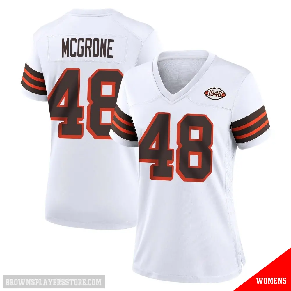 Display your Browns spirit year-round with this #48 Women's Cameron McGrone White Game Cleveland Browns 1946 Collection Alternate Jersey. Whether you're in the crowd or lounging at home, it's the ideal way to showcase your love for Browns.