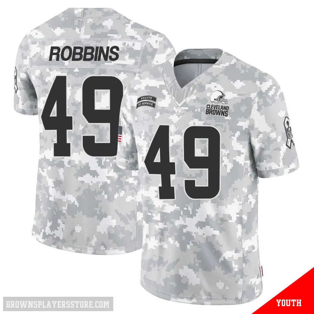 Display your Browns spirit year-round with this #49 Youth Aidan Robbins Arctic Camo Limited Cleveland Browns 2024 Salute to Service Jersey. Whether you're in the crowd or lounging at home, it's the ideal way to showcase your love for Browns.