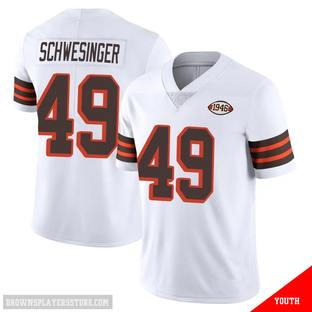 Display your Browns spirit year-round with this #49 Youth Carson Schwesinger White Limited Cleveland Browns Vapor 1946 Collection Alternate Jersey. Whether you're in the crowd or lounging at home, it's the ideal way to showcase your love for Browns.