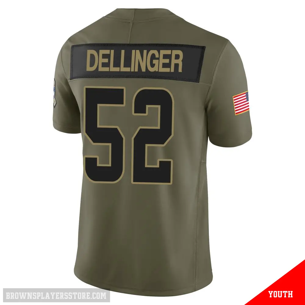 Display your Browns spirit year-round with this #52 Youth Garrett Dellinger Olive Limited Cleveland Browns 2025 Salute to Service Jersey. Whether you're in the crowd or lounging at home, it's the ideal way to showcase your love for Browns.