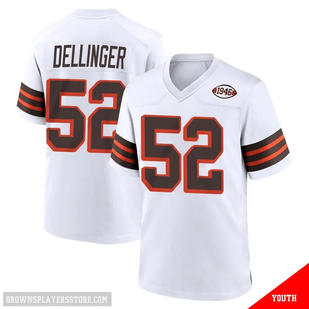 Display your Browns spirit year-round with this #52 Youth Garrett Dellinger White Game Cleveland Browns 1946 Collection Alternate Jersey. Whether you're in the crowd or lounging at home, it's the ideal way to showcase your love for Browns.