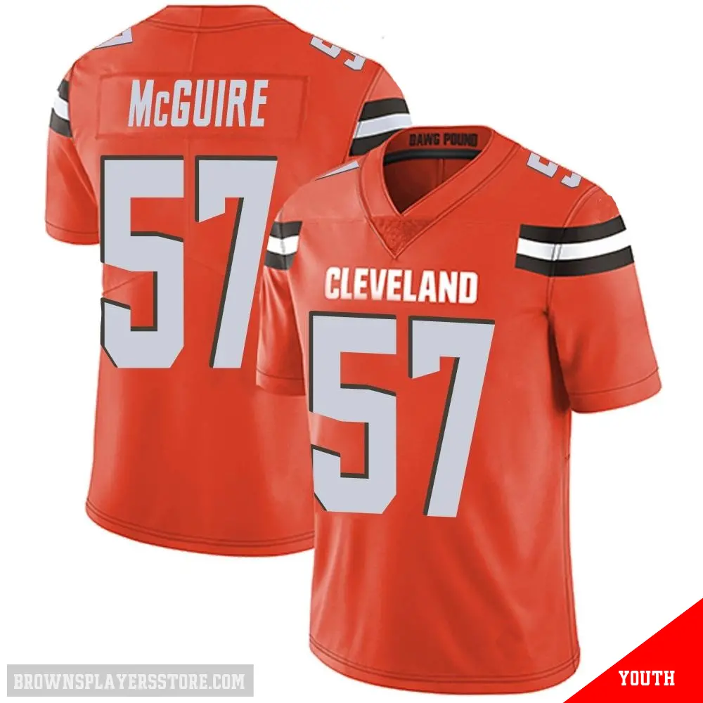 Display your Browns spirit year-round with this #57 Youth Isaiah McGuire Orange Limited Cleveland Browns Alternate Vapor Untouchable Jersey. Whether you're in the crowd or lounging at home, it's the ideal way to showcase your love for Browns.