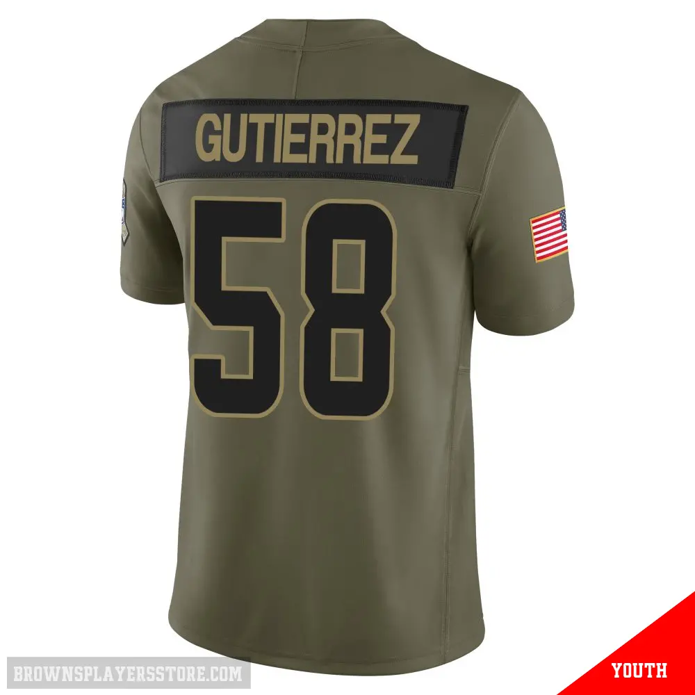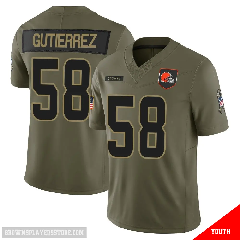 Display your Browns spirit year-round with this #58 Youth Sebastian Gutierrez Olive Limited Cleveland Browns 2025 Salute to Service Jersey. Whether you're in the crowd or lounging at home, it's the ideal way to showcase your love for Browns.