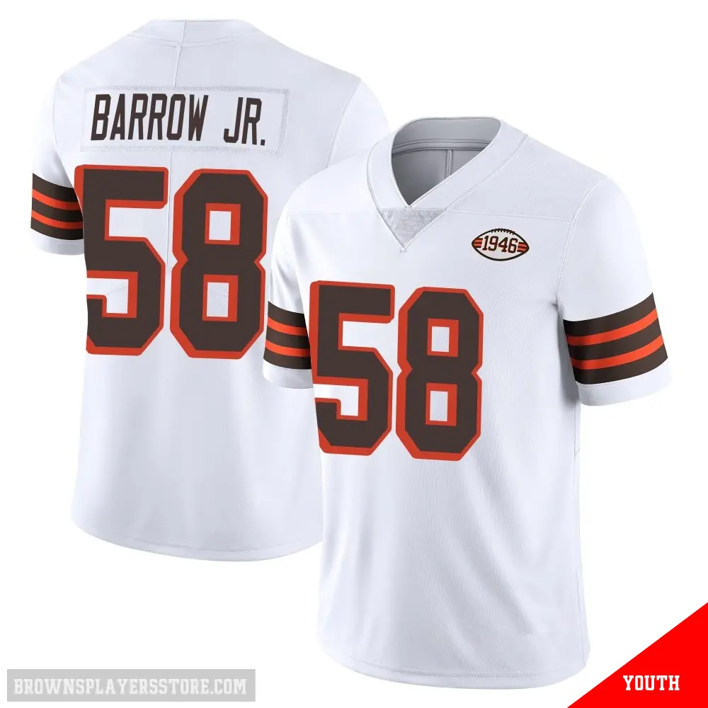Display your Browns spirit year-round with this #58 Youth Simeon Barrow Jr. White Limited Cleveland Browns Vapor 1946 Collection Alternate Jersey. Whether you're in the crowd or lounging at home, it's the ideal way to showcase your love for Browns.