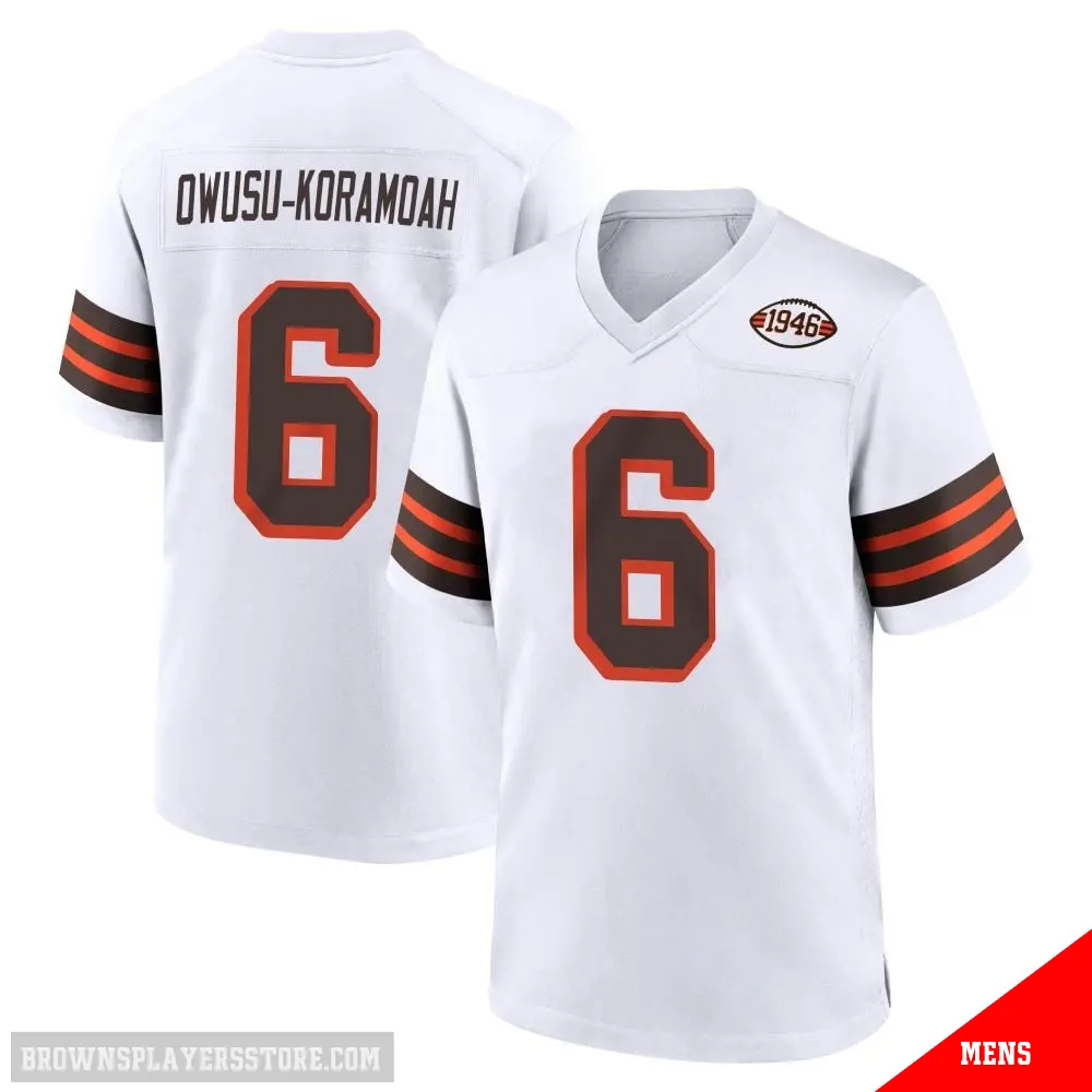 Display your Browns spirit year-round with this #6 Men's Jeremiah Owusu-Koramoah White Game Cleveland Browns 1946 Collection Alternate Jersey. Whether you're in the crowd or lounging at home, it's the ideal way to showcase your love for Browns.