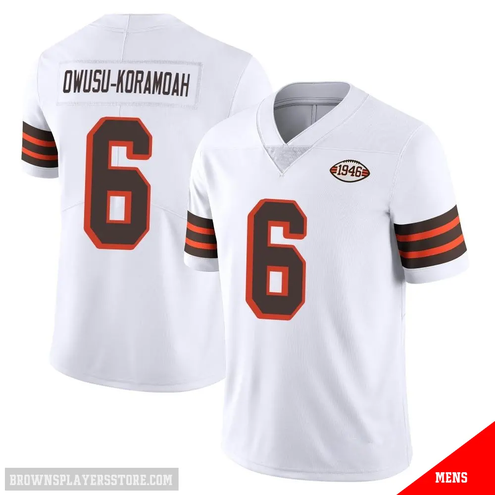 Display your Browns spirit year-round with this #6 Men's Jeremiah Owusu-Koramoah White Limited Cleveland Browns Vapor 1946 Collection Alternate Jersey. Whether you're in the crowd or lounging at home, it's the ideal way to showcase your love for Browns.