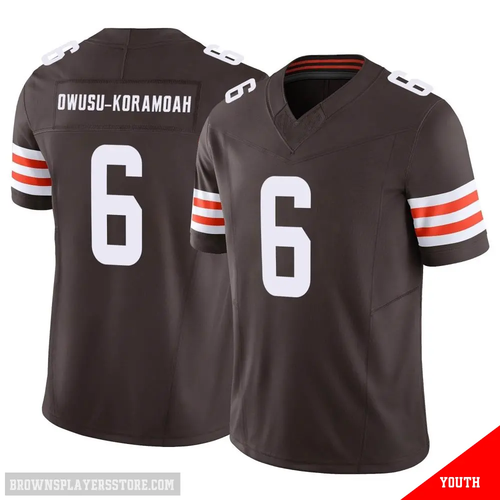 Display your Browns spirit year-round with this #6 Youth Jeremiah Owusu-Koramoah Brown Limited Cleveland Browns Vapor F.U.S.E. Jersey. Whether you're in the crowd or lounging at home, it's the ideal way to showcase your love for Browns.