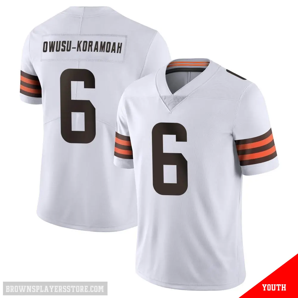 Display your Browns spirit year-round with this #6 Youth Jeremiah Owusu-Koramoah White Limited Cleveland Browns Vapor Untouchable Jersey. Whether you're in the crowd or lounging at home, it's the ideal way to showcase your love for Browns.