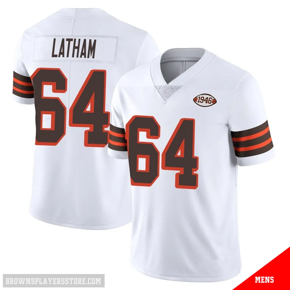 Display your Browns spirit year-round with this #64 Men's Brady Latham White Limited Cleveland Browns Vapor 1946 Collection Alternate Jersey. Whether you're in the crowd or lounging at home, it's the ideal way to showcase your love for Browns.