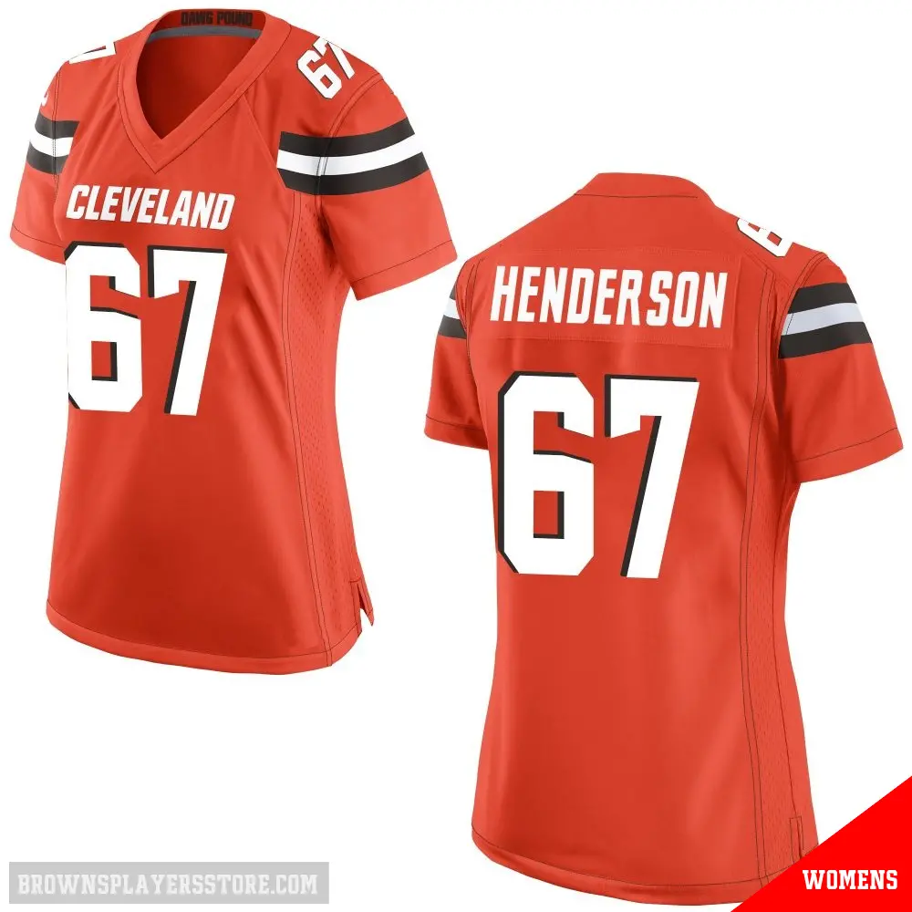 Display your Browns spirit year-round with this #67 Women's LaDarius Henderson Orange Game Cleveland Browns Alternate Jersey. Whether you're in the crowd or lounging at home, it's the ideal way to showcase your love for Browns.