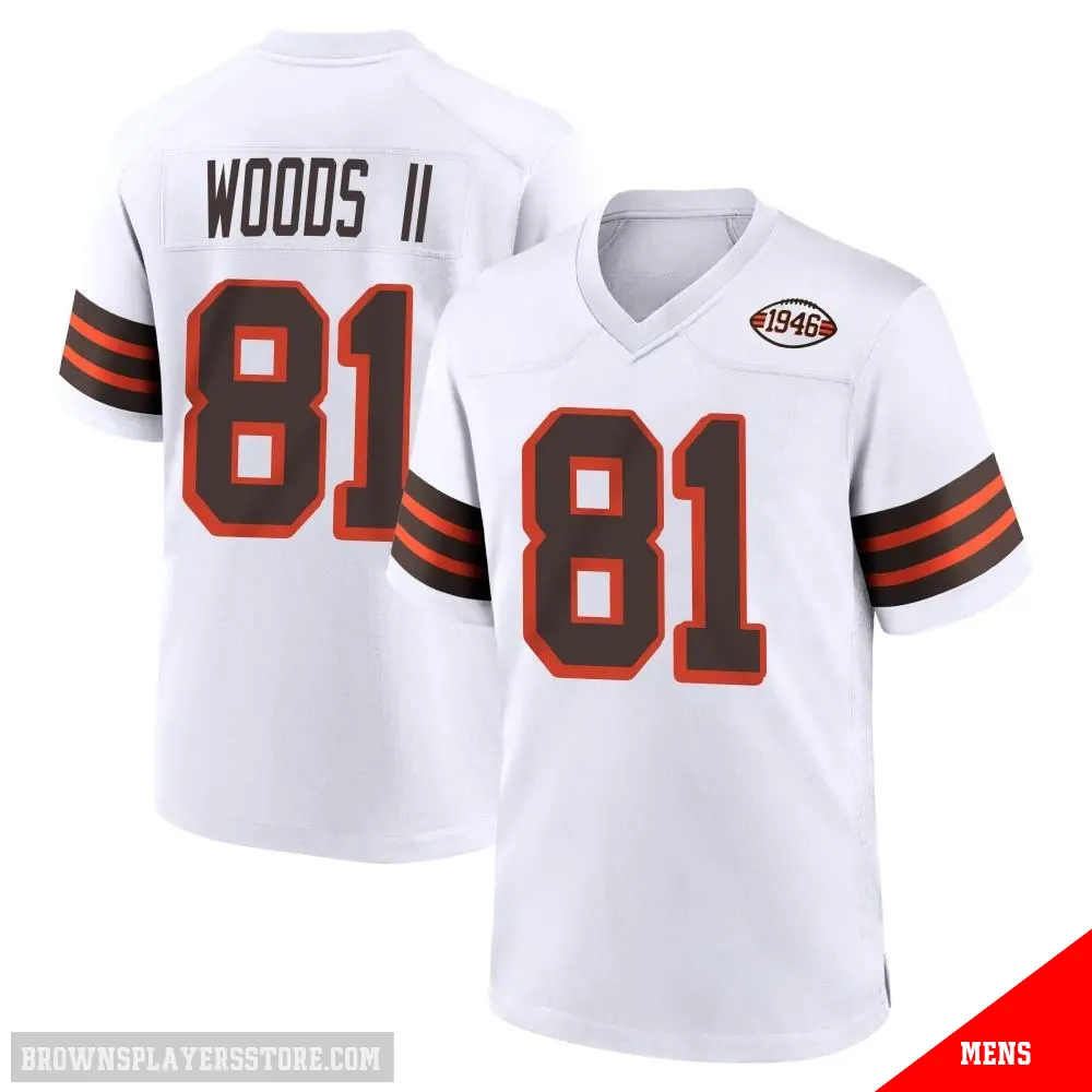 Display your Browns spirit year-round with this #81 Men's Michael Woods II White Game Cleveland Browns 1946 Collection Alternate Jersey. Whether you're in the crowd or lounging at home, it's the ideal way to showcase your love for Browns.