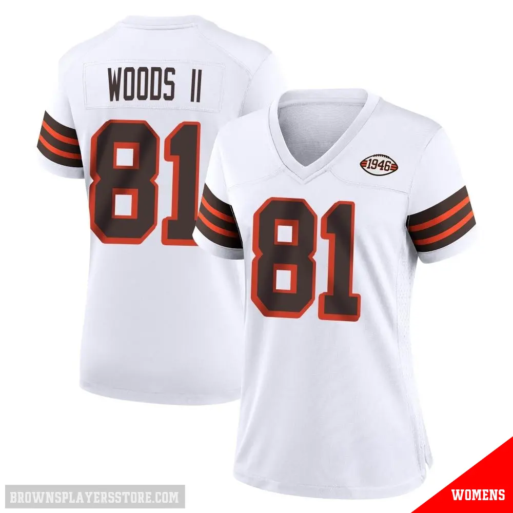 Display your Browns spirit year-round with this #81 Women's Michael Woods II White Game Cleveland Browns 1946 Collection Alternate Jersey. Whether you're in the crowd or lounging at home, it's the ideal way to showcase your love for Browns.