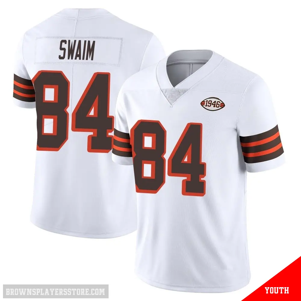 Display your Browns spirit year-round with this #84 Youth Geoff Swaim White Limited Cleveland Browns Vapor 1946 Collection Alternate Jersey. Whether you're in the crowd or lounging at home, it's the ideal way to showcase your love for Browns.