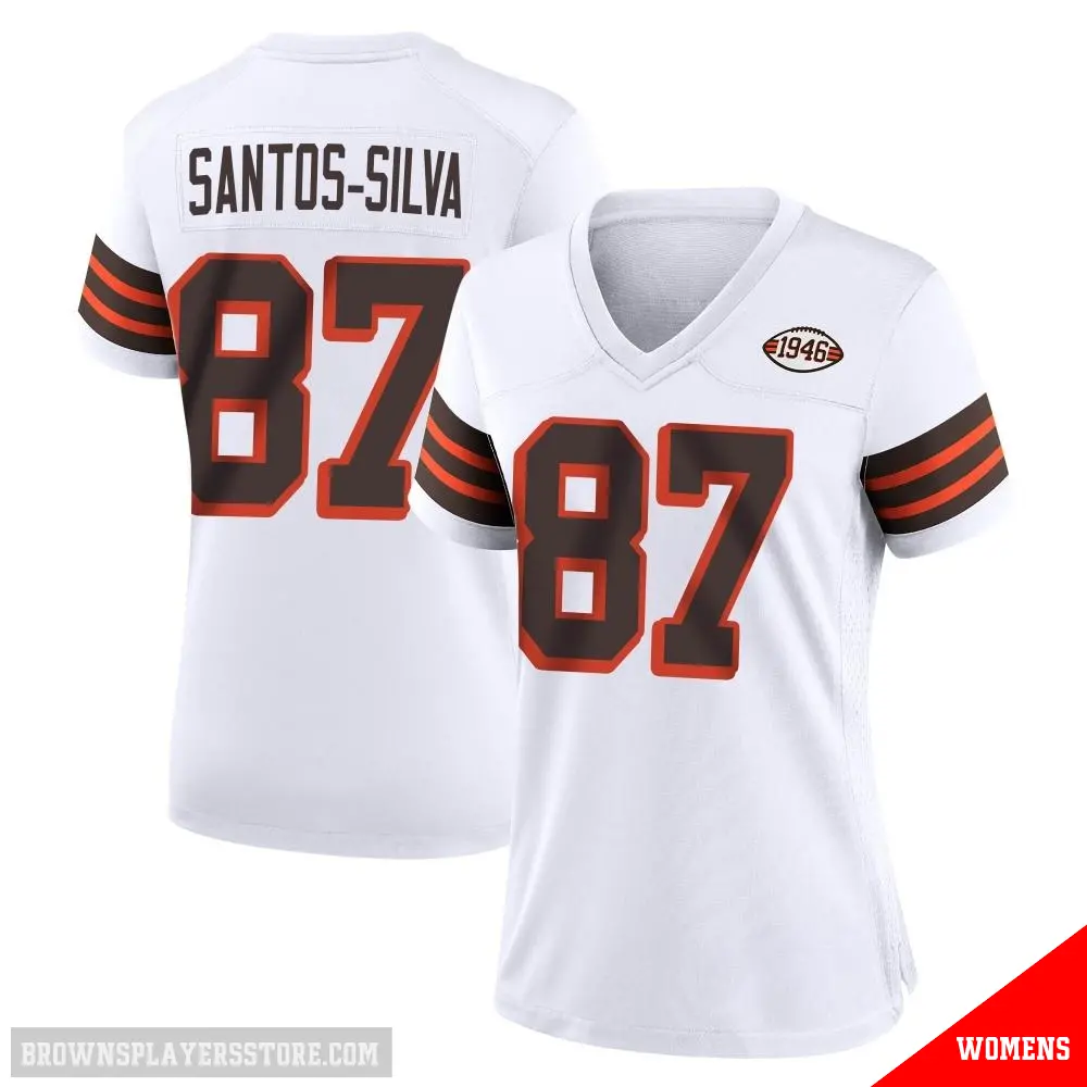 Display your Browns spirit year-round with this #87 Women's Marcus Santos-Silva White Game Cleveland Browns 1946 Collection Alternate Jersey. Whether you're in the crowd or lounging at home, it's the ideal way to showcase your love for Browns.