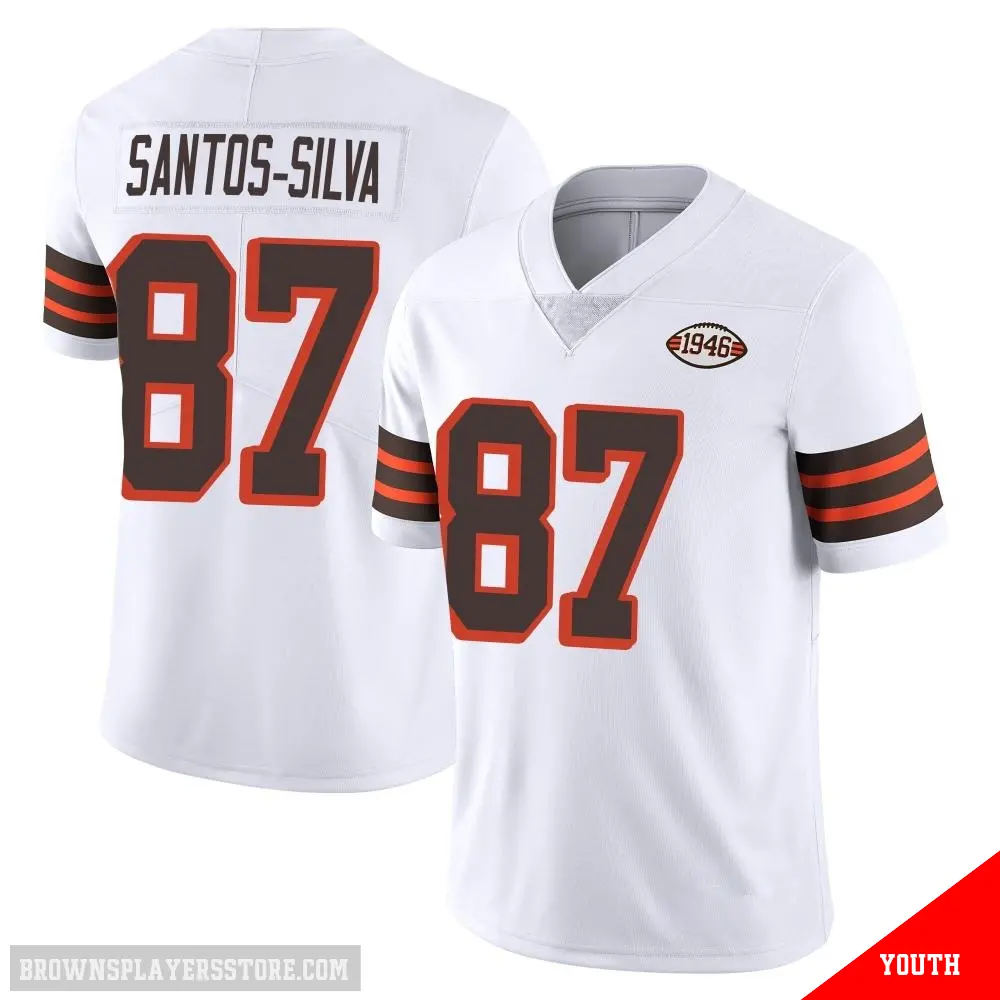 Display your Browns spirit year-round with this #87 Youth Marcus Santos-Silva White Limited Cleveland Browns Vapor 1946 Collection Alternate Jersey. Whether you're in the crowd or lounging at home, it's the ideal way to showcase your love for Browns.