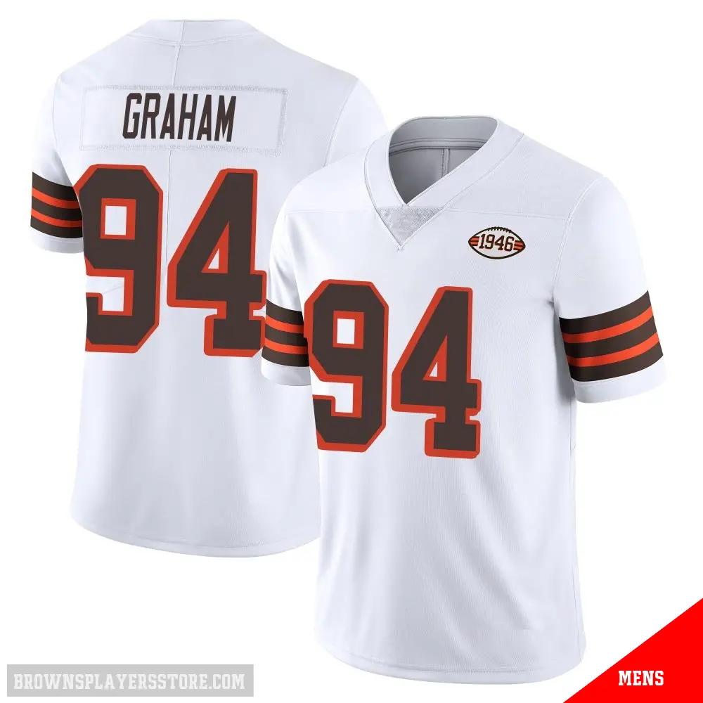 Display your Browns spirit year-round with this #94 Men's Mason Graham White Limited Cleveland Browns Vapor 1946 Collection Alternate Jersey. Whether you're in the crowd or lounging at home, it's the ideal way to showcase your love for Browns.