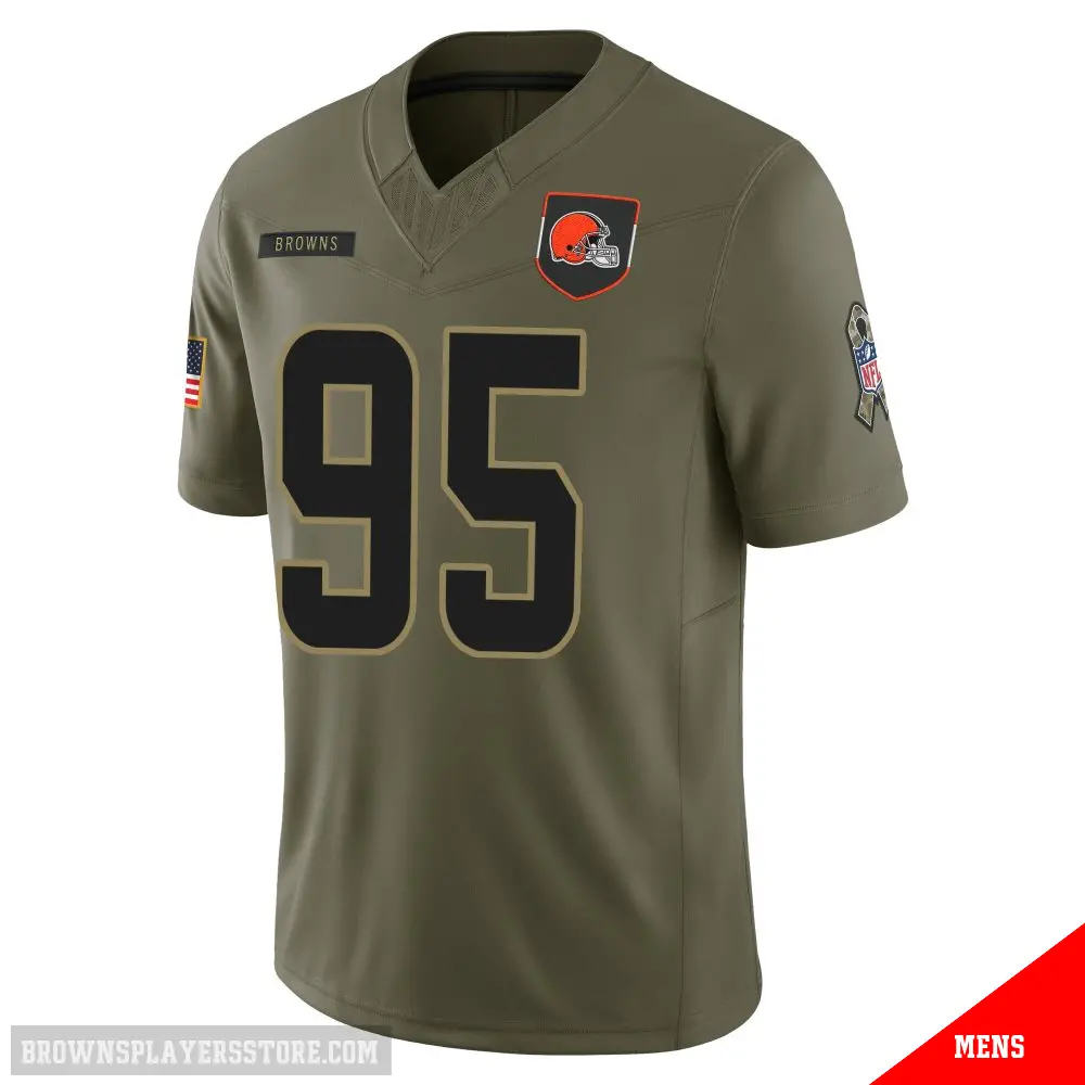 Display your Browns spirit year-round with this #95 Men's Myles Garrett Olive Limited Cleveland Browns 2025 Salute to Service Jersey. Whether you're in the crowd or lounging at home, it's the ideal way to showcase your love for Browns.